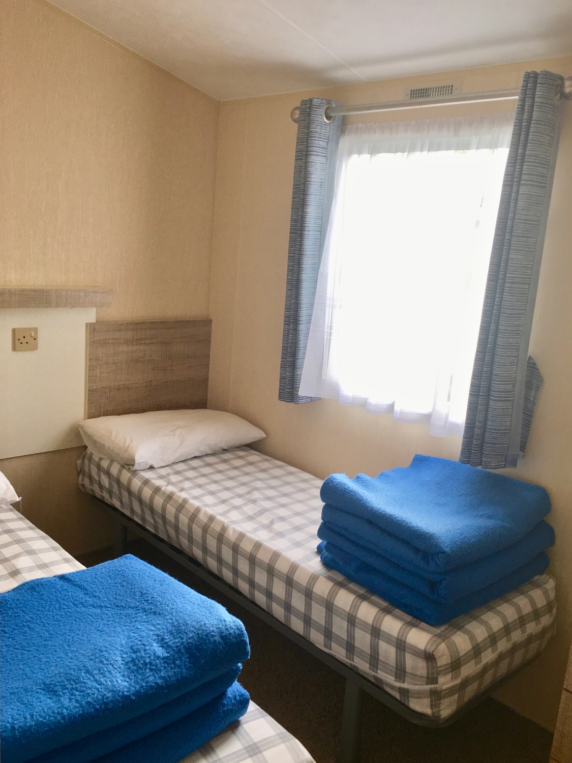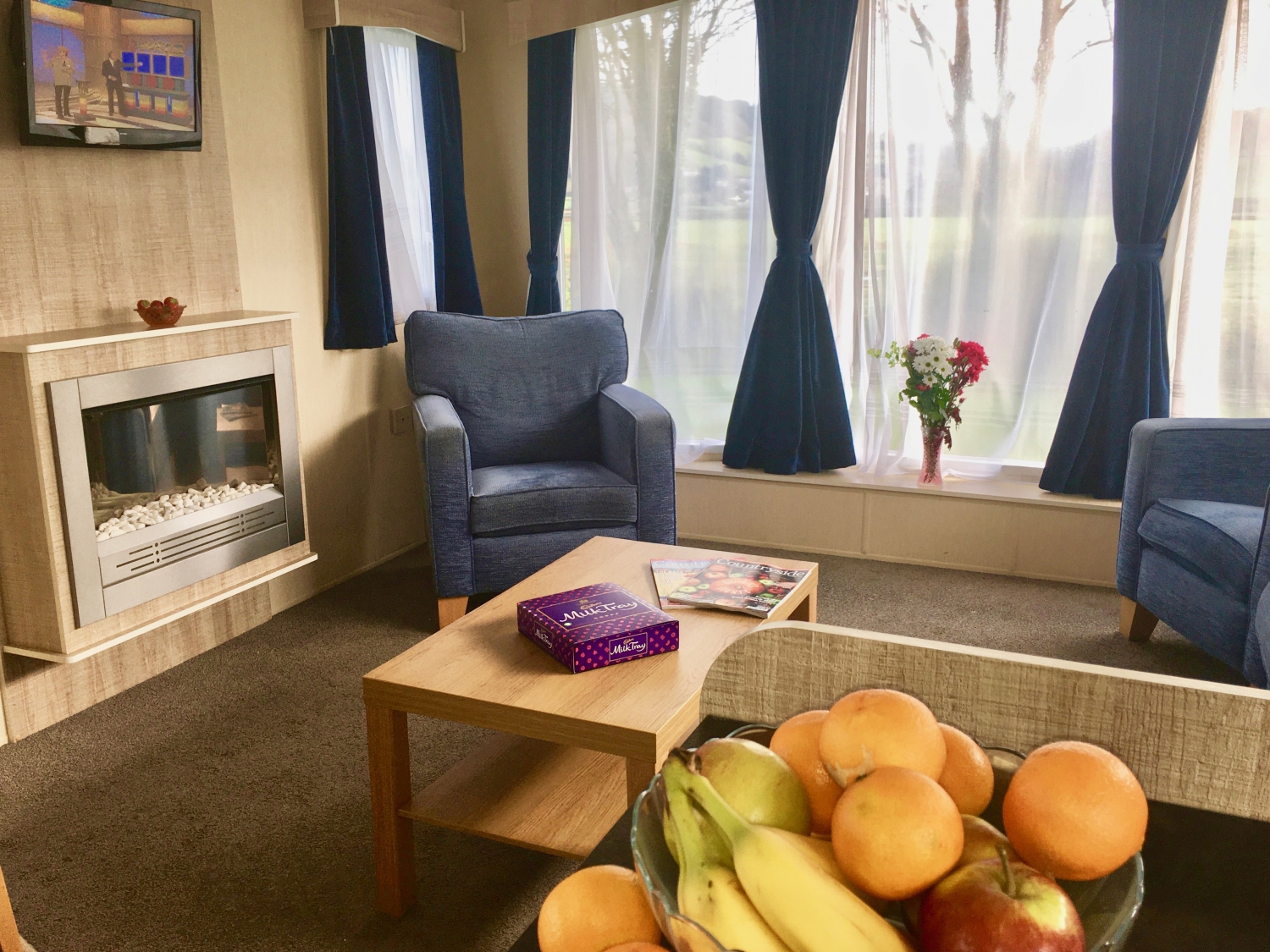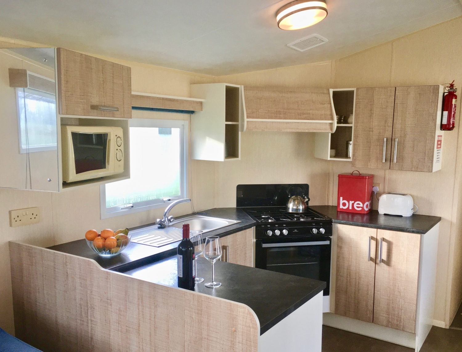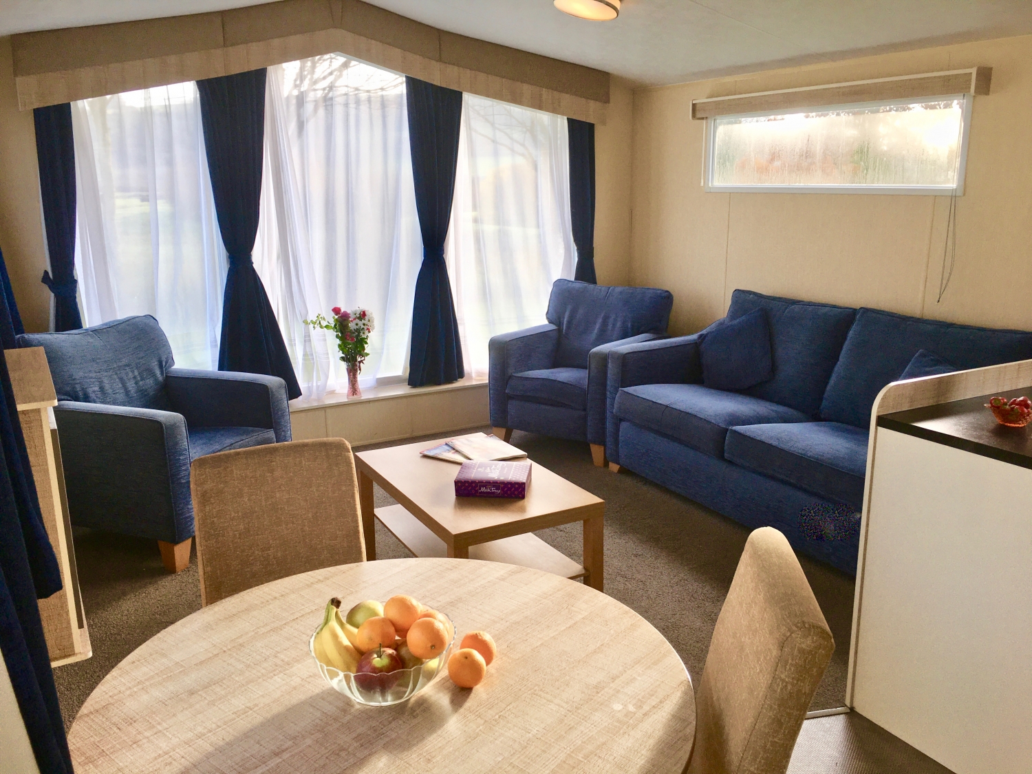 NEW IN 2012 These spacious, caravans are sure to impress. They have 2 bedrooms: a double with a kingsize bed and en suite toilet and a twin room, which will convert to a double. The family bathroom has a toilet, wash basin and a large shower cubicle. The large kitchen has a full size gas cooker and a microwave. As well as the comfortable 3 piece suite in the lounge, which incorporates a sofa bed, you’ll be thrilled with the view through the massive front windows. Heating is provided in every room.